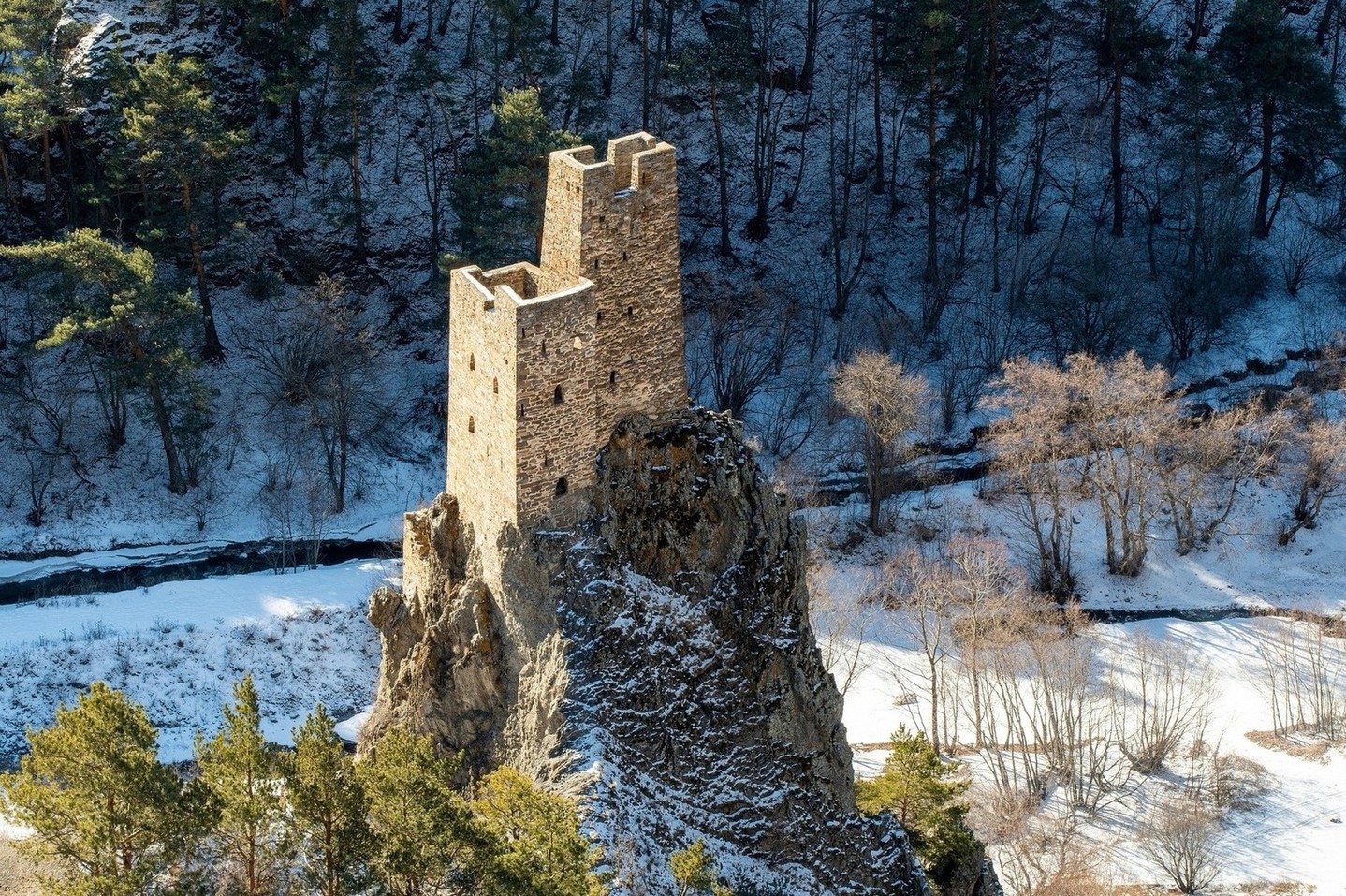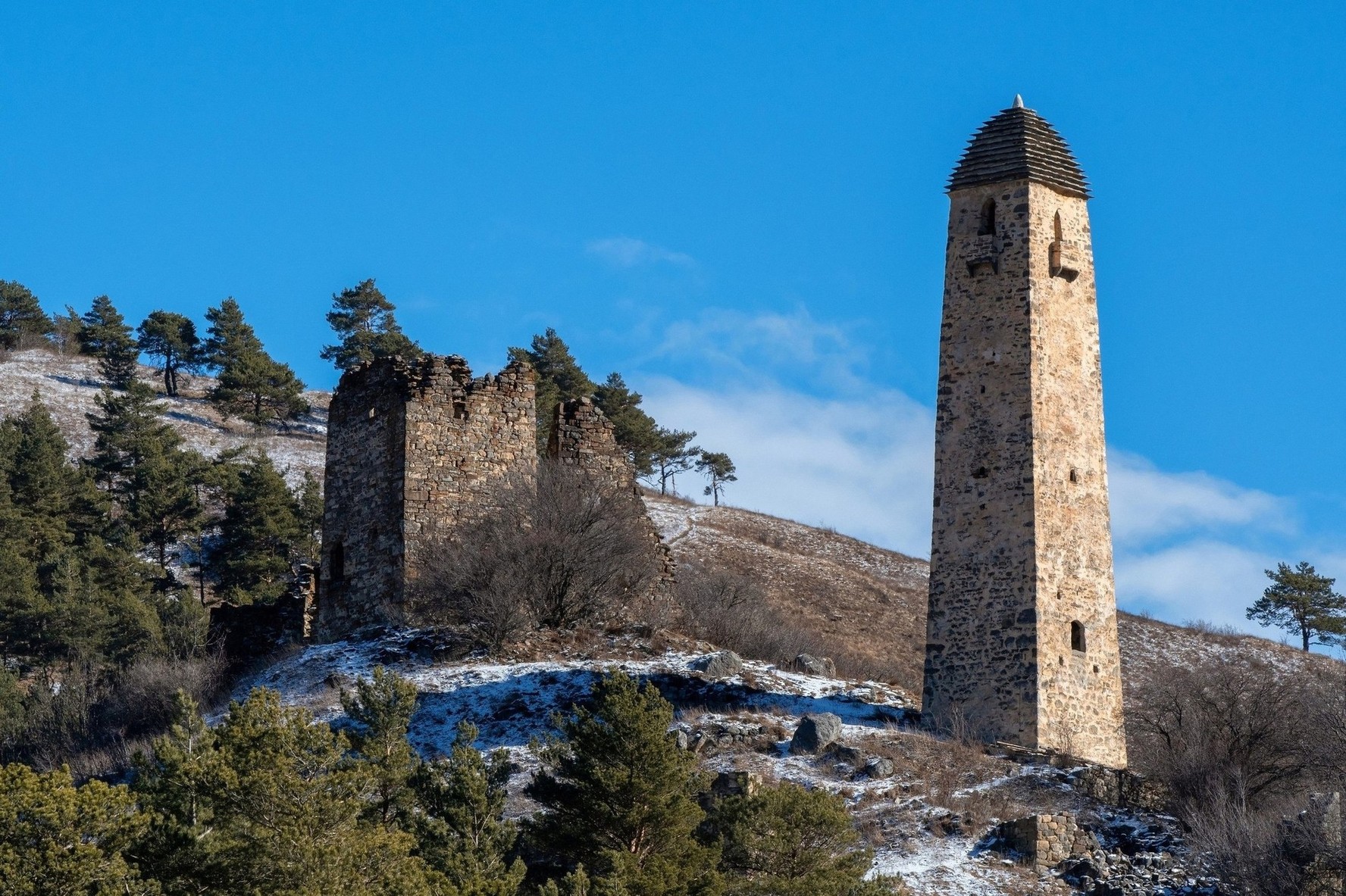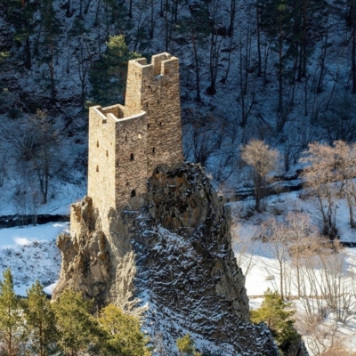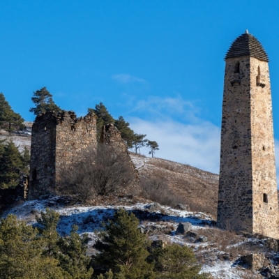 Осмотр башни Курта и Тага. Башня Курта и Тага — это остатки старинного богатого дома местных правителей, расположенные на горном утесе, откуда открываются потрясающие панорамы на горы Кавказского хребта.